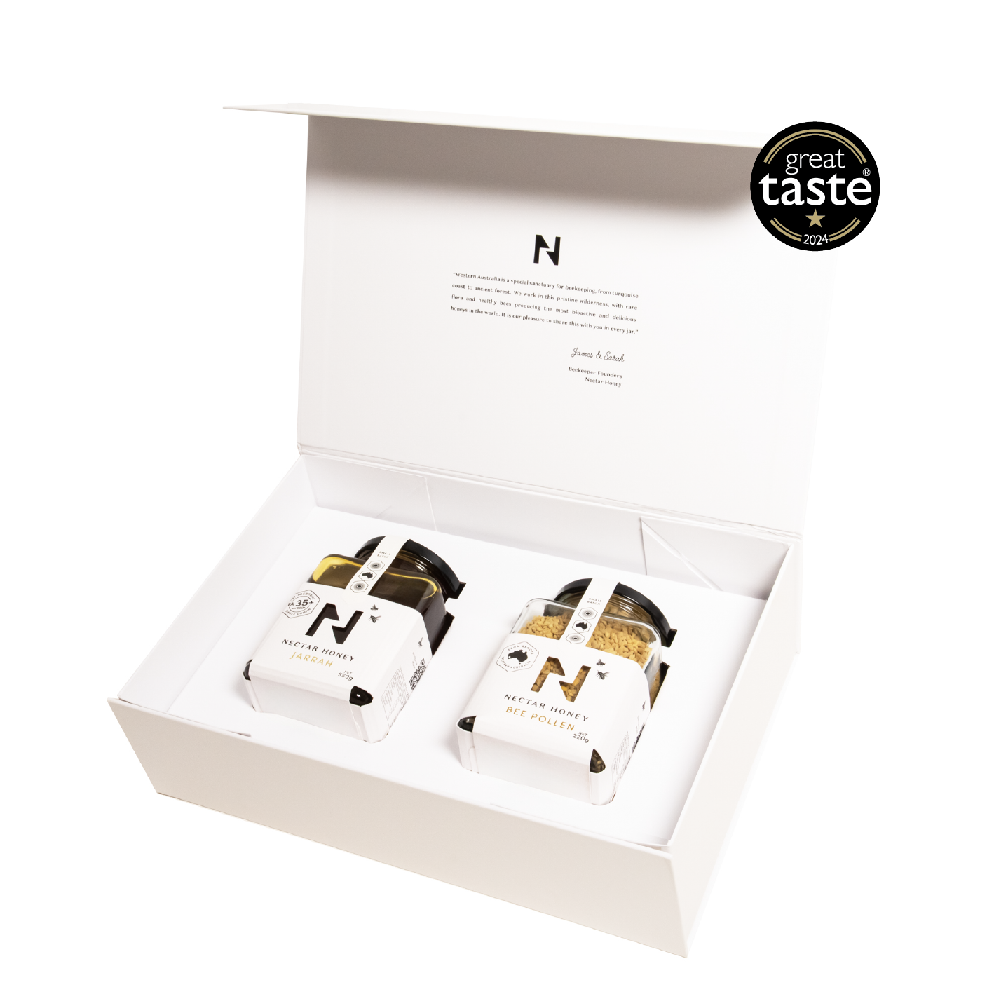 Indulge in Nature's Premium Wellness with the extraordinary synergy of Australian Jarrah honey and natural Bee Pollen in this exquisite gift collection.